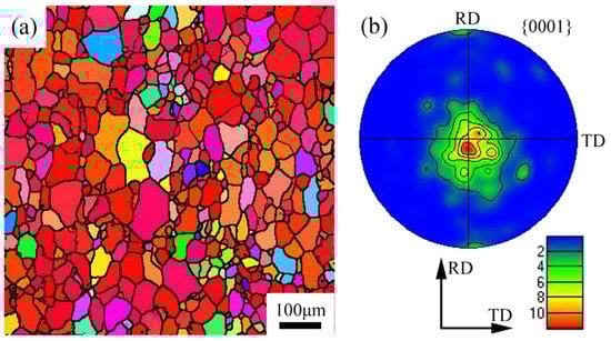 In the present study, the as-received material was a commercial hot-rolled AZ31 (Mg-3%Al-1%Zn) magnesium alloy sheet. Specimens were annealed at 530 °C for 1 h. The observation shows that the material exhibits a strong {0001} basal texture and a twin-free equiaxed grain structure, with an average grain size of ~35 μm, as shown in Figure 1. An eight-sided prism with bottom sides and edge sides measuring 8 mm each was obtained from the as-received material. Specimens were compressed at a strain rate of 0.01 s−1 and a final strain of 3.9%, with the loading direction (LD) aligned parallel to the transverse direction (TD).