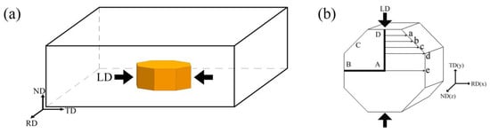 The hardness was measured at 0.5 mm intervals along lines a to e. Microstructure and texture observations were made in areas A–D after the compression (see Figure 2b). The specimens were electrolytic polished for 90 s in a Struers ACII electrolyte solution at −5 °C and 20 V. The electron backscatter diffraction (EBSD) observations were conducted using a Zeiss Supra 55 FEG-SEM (Jena, Germany) and twinning behaviors were analyzed using HKL channel 5 software.
