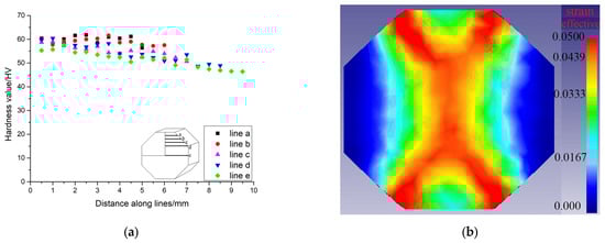 (a) Hardness values measured along lines of the eight-sided prism sample. (b) The equivalent plastic strain Eyy distribution via finite element simulation following compression.