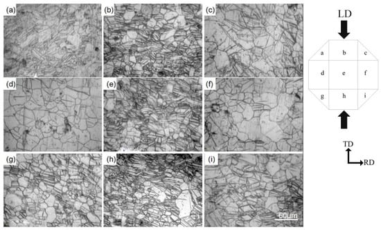 To investigate the effect of local strain on the microstructure, the octagonal surface is divided into nine areas labeled as letters a–i. A large number of differences are denoted in the regions a–i, as shown in Figure 4. It can be seen that the twinning volume fraction is higher in the center areas (b, e, and h), followed by the corner areas (a, c, g, and i), and then the side areas (d and f). The grain sizes significantly decreased in the center regions compared to those in other regions. It is worth noting that a more localized strain exists in the central regions, and this result is explained in detail in the next section.