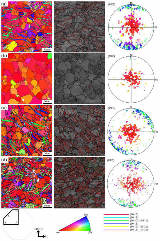 Figure 5 shows the orientation image maps, grain boundaries maps, and {0001} pole figures of four regions. Red lines represent {10-12} extension twinning boundaries. It can be seen that twinning is significantly present in regions A, C, and D, while region B shows minimal to no twinning. This may be due to the fact that region A and region D experienced direct compression from the force, resulting in normal strain with minimal local shear strain [], while region C experienced both normal and shear strain. In addition, region B was located outside the directly compressed area, which hindered twinning activation due to the low normal strain. From the {0001} pole figures, it is evident that the matrix orientations are centrally distributed around the ND, while the variant orientations rotate 86.4° after compression. The distinction is based on the different orientations of variants in region A and region D, which rotate to the TD (y), while variant orientations in region C deviate by approximately 45° between the TD (y) and RD (x), referred to as the xy-direction for ease of reference. From the above analysis, it can be seen that the twinning orientations rotate to different regions due to the non-uniformity of the stresses.