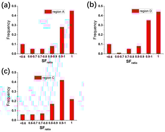 Frequency of twin variants displayed in terms of SFratio using an assumption of uniaxial loading: (a) 123 twin variants in region A, (b) 191 twin variants in region D, and (c) 129 twin variants in region C.