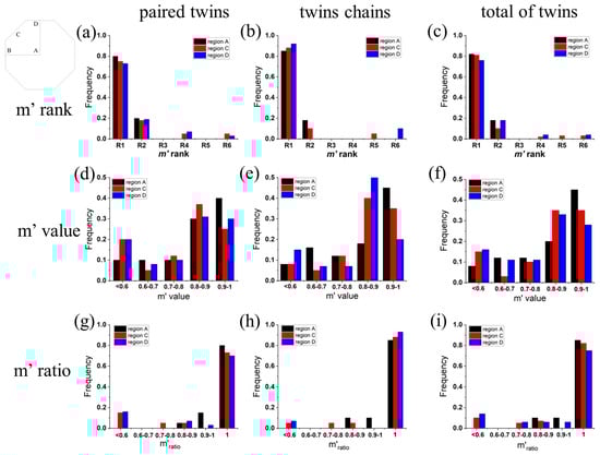 Distribution of m’ rank, m’ value, and m’ ratio of the observed paired twins (a,d,g), twin chains (b,e,h), and all twin variants (c,f,i) for the three regions.