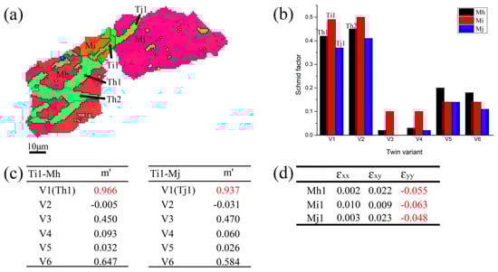 In this research, the twin–twin interactions occur in specimens. It is known that deformation twins are formed in accordance with external stress, aided by the concentrated stress due to dislocation pile-up []. Thus, what would happen if twinning variants meet? Figure 8a illustrates a twin chain Th1-Ti-Tj. across three neighboring grains in region A. The specific characteristics of six potential twin variants V1–V6 of the parent grain Mh, Mi, and Mj are depicted in Figure 8b. It can be seen that variants Th1, Ti, and Tj all exhibit the second-highest SFs, which are very close to the highest SFs. The distribution of the strain compatibility factor m’ for the twin chain is displayed in Figure 8c. The strain compatibility factor m’ exhibits its highest value of 0.966 between Ti and Th1 and also records the highest value of 0.937 between Ti and Tj. In order to investigate the relationship between the activated twin variants and the local strain state, the strain tensors of all the activated twin variants were calculated using the method described by Luo et al. []. To reveal the role of these twins, the twin strain tensors for Th1, Ti, and Tj are illustrated in Figure 8d. For the region A, the compression direction is y-direction. Thus, the values of εyy are negative. The absolute value of εyy is significantly larger than zero, which suggests that it can coordinate the strain along the compression axis []. In addition, the values of εxx are positive when there is an extension strain component along the x-direction. For region A, the activation of the twin chain is essential for facilitating compressed deformation in the force direction, influenced by a combination of the Schmid factor criterion and strain accommodation.