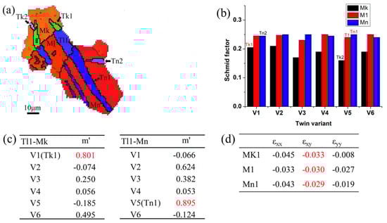 For region C, the stress state is relatively complex. Figure 9a illustrates a twin chain Tk1-Tl-Tn1 spanning three adjacent grains in region C. In this study, the distribution of SF is calculated using the pure shear model for region C. It can be seen that the SF values are significantly lower than 0.5 (Figure 9b). The twinning SF for Tk1 is the second highest, for T1 it is the fifth highest, and for Tn1 it is the third highest, respectively. The results indicate that the activation of twin variants is not influenced by the Schmid factor criterion. Figure 9c illustrates that the strain compatibility factor m’ is highest between Tl and Tk1 (0.801) and also highest between Tl and Tn1 (0.895). This twin chain activation indicates the effect of strain accommodation, which is independent of the force direction. It is reported that the induced internal stresses, when accommodation is easy, are small and even low macroscopic SFs are sufficient to form twins [,]. Here, strain accommodation in neighbor grains can clarify this low SF variant activation. Figure 9d illustrates the twin strain tensors of Tk1, Tl, and Tn1. It can be seen that the absolute value of εxy is significantly larger than zero, which suggests that it can coordinate the strain along the xy-direction. Consequently, the twin variant possessing the highest m’ rank is favored for activation in the form of a twin chain to release the local stress concentration.