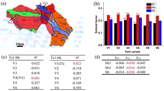 Figure 10a illustrates another twin chain Tr1-Ts1-Tt across three adjacent grains in region C. The SF values of variants Tr1, Ts1, and Tt are all significantly less than 0.5, as shown in Figure 10b. The twinning SF for Tr1 is the fifth highest, for Ts1 it is the fourth highest, and for Tt it is the third highest, respectively. It can be seen that the activation of twin variants is not influenced by the Schmid factor criterion. Figure 10c illustrates that the strain compatibility factor m’ between Ts1 and Tt is the highest (0.823), whereas the factor between Ts1 and Tr1 is the fifth highest (−0.001). This observation suggests that the activated twin chain does not conform to the law of strain accommodation. The twin strain tensors of Tr1, Ts1, and Tt mainly coordinate the strain along the y-direction, which indicates that the twin chain experiences compressed deformation in the y-direction rather than the xy-direction, as shown in Figure 10d. This indicates that the generation of certain paired twins cannot be explained by the strain compatibility factor or Schmid factor.