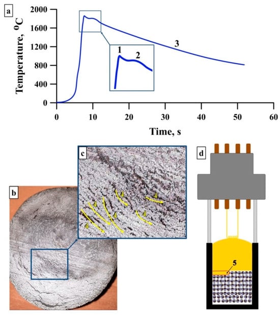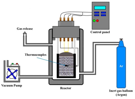 Figure 2 presents semi-industrial conditions in the SHS process. The reactor was evacuated by a pump and filled with argon to a pressure of 5 MPa. The synthesis reaction was initiated by the localized heating of the flammable layer using a molybdenum hot filament. BP20/5 thermocouples were introduced in the initial powder mix to measure the synthesis temperature [].