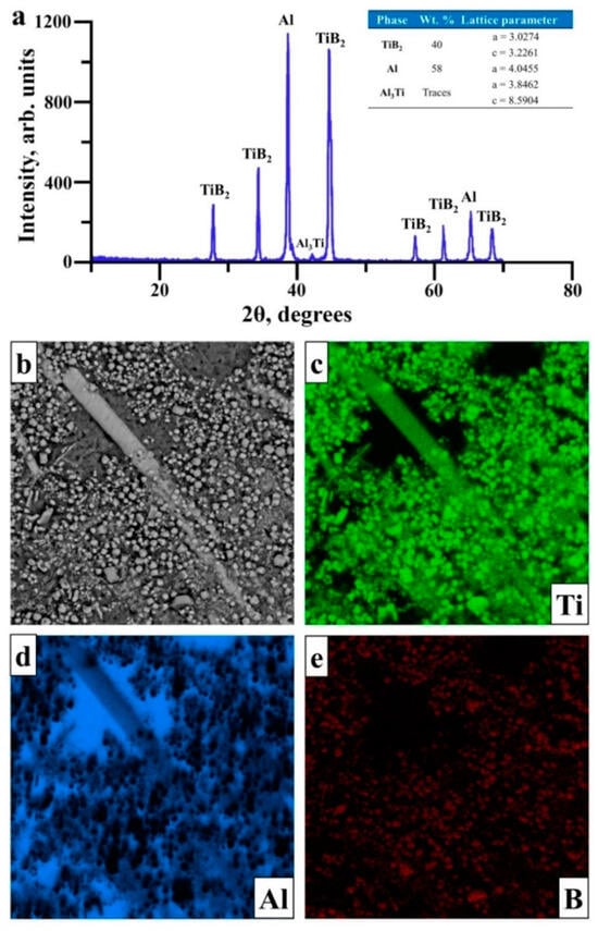 The XRD pattern and EDX mapping of the surface of SHS products obtained from the Al–Ti–B powder are presented in Figure 6. These products contain TiB2 and Al phases. Crystal lattice parameters of these phases do not qualitatively differ from each other and are comparable with those of reference Al and TiB2 phases [,]. There are also traces of the Al3Ti intermetallic phase, while EDX mapping of the SHS product structure (Figure 6b–e) shows Ti and B elements nearby the detected particles. At the same time, the matrix consists of Al and also Ti elements in some areas.