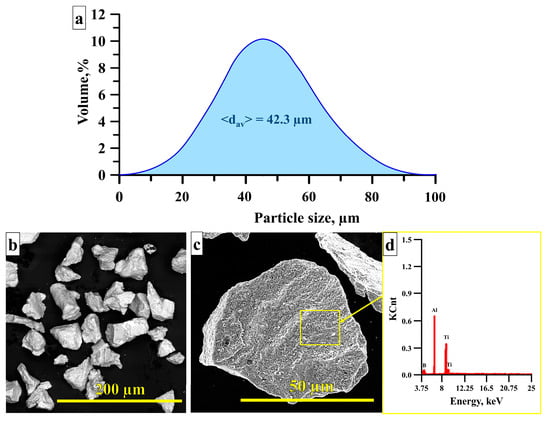Figure 7 presents the particle size distribution of the Al–TiB2 metal matrix composite, SEM images of its particles, as well as an EDX analysis of the surface structure of these particles. The particle size after milling ranges from 0.5 to 95 µm, and their average size is 42.3 µm. The powder particles are fragmented, and their surface consists of TiB2 inclusions.