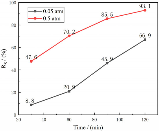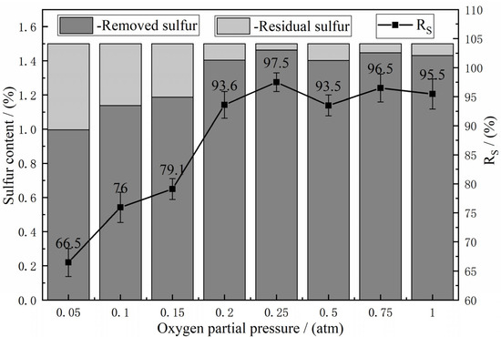 - Under the condition of 1420 °C, the desulfurization rate of slag oxidized for 120 min at low oxygen pressure ( < 0.20 bar) increases with the increase in oxygen partial pressure. At high oxygen pressure ( ≥ 0.20 bar), the desulfurization rate of slag samples does not change with the change in oxygen partial pressure, and the desulfurization rate is higher than 93.5%. However, the rise was rather small. In actuality, sulfur reduction might be accomplished using air.