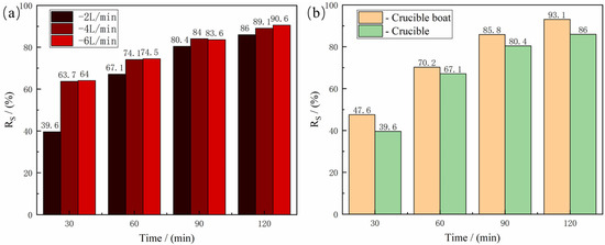 | Sample | Crucible Shape | O2 (bar) | Reaction Time (min) | Gas Flow (L min−1) | RS (%) |