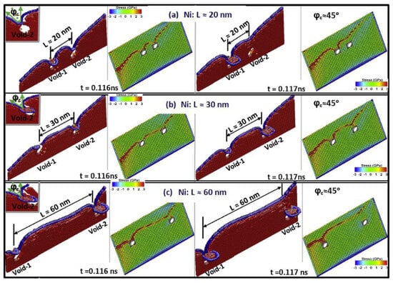 - Liu, T.X.; Groh, S. Atomistic modeling of the crack-void interaction in alpha-Fe. Mater. Sci. Eng. A 2014, 609, 255–265. [Google Scholar] [CrossRef]