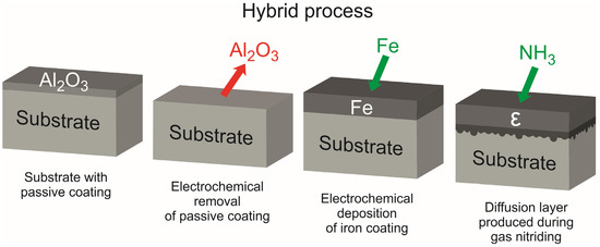 - The results of the work prove that a surface treatment of aluminum substrates, consisting of subsequent electrochemical processes aimed to remove the passive aluminum oxide layer and then protect the substrate against its re-oxidation by plating with a coating of one of such metals as chromium, copper, nickel and iron, combined with gas nitriding, is an effective hybrid method enabling the diffusion of nitrogen through the protective coating into the aluminum substrate, resulting in the formation of a diffusion layer. The most favorable nitriding effects are obtained at 530 °C/10 h in the case of electroplated iron and nickel coatings, for which the nitrogen range in the substrate reaches approximately 12 µm and its concentration in the diffusion zone is at the level of 1023 at·cm−3. An important measure ensuring the efficiency of nitriding, by reducing the risk of the re-passivation of aluminum, is the use of high-purity ammonia in the processes, which guarantees limiting gas contamination with traces of oxygen at a maximum of 2 ppm.