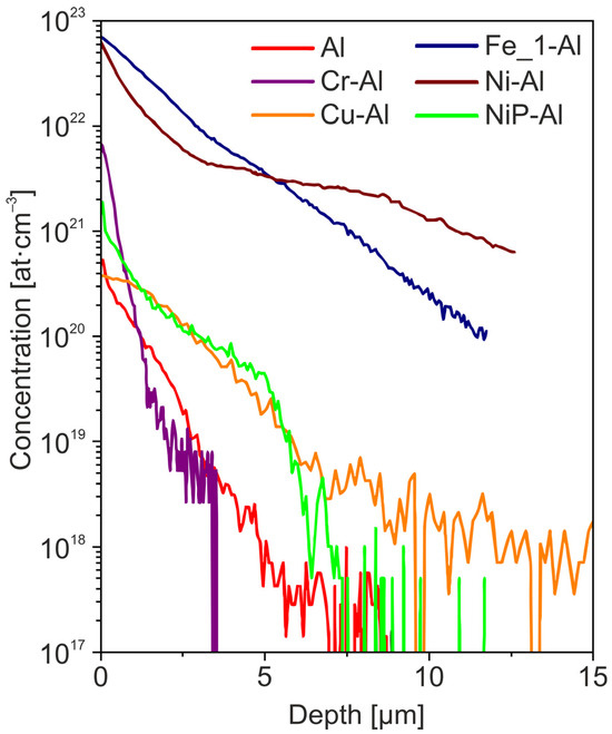In the first stage of the work, preliminary research was carried out to verify the effectiveness of the proposed method of producing nitride layers on aluminum alloys in a hybrid process, in particular confirming the thesis that nitrogen can diffuse into the aluminum-based substrate through an appropriate outside metallic coating and form a diffusion zone. For this purpose, technically pure aluminum substrates were electroplated with coatings of selected metals. The test used coatings as thin as possible, with a nominal thickness of approximately 1 µm. The coatings were produced by typical electrochemical methods used in practice, with prior treatment aimed to effectively eliminate the passive layer on the substrate. The as-prepared substrates were subjected to the gas nitriding process at a temperature of 530 °C and a time of 10 h in a partially dissociated 5N ammonia environment (with dissociation approx. 30%). The effects of nitriding were assessed based on the analysis of nitrogen distributions in the substrate determined by the SIMS method. The test results are shown in Figure 2.