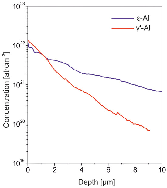 The analysis of the nitrogen distributions presented in Figure 2 indicates that the variants of aluminum substrates with a nickel and iron coating meet the assumptions of the proposed hybrid processing concept and enable obtaining a nitrogen diffusion zone in the substrate. The assumption of the proposed concept was also to create diffusion layers in a hybrid process, the outer zone of which will be a layer of metal nitride produced from the coating metal predeposited on the aluminum substrate. Although both metals, as well as nickel, form nitrides, the model system of iron coating–aluminum substrate was chosen for the further research due to the ease of production and control of the iron nitriding in gas process, resulting in the desired nitrogen content and phase composition of the nitride layers. During nitriding, such a system relatively quickly transforms into an iron nitride layer–aluminum substrate system. Depending on the conditions of the nitriding process, in particular the value of the nitrogen potential, the process will result in a different phase composition of the layer (ε, γ′), which may have a significant impact on the transport of nitrogen to the aluminum substrate. In order to select optimal nitriding conditions for the diffusion of nitrogen through the nitride layer into the aluminum substrate, two model systems nitrided at 530 °C were subjected to an analysis of nitrogen diffusion in the substrate, in which an ε-type iron nitride layer was produced on an aluminum substrate in one variant (ε-Al), and in the other variant a (γ′-Al) γ′-type nitride layer (Table 2). The results of this experiment are shown in Figure 3. The analysis of nitrogen distribution in the substrate clearly shows that due to the clearly higher nitriding kinetics, the processes should be carried out in conditions that lead to the formation of ε-type iron nitride layers on the aluminum substrate. This nitride, due to its relatively high solubility and, as a result, high nitrogen supply, paired with and may favor the transport of nitrogen to the substrate.