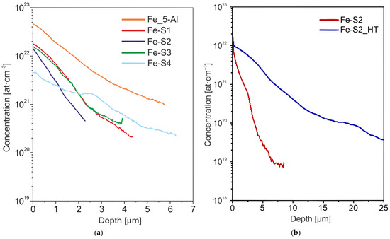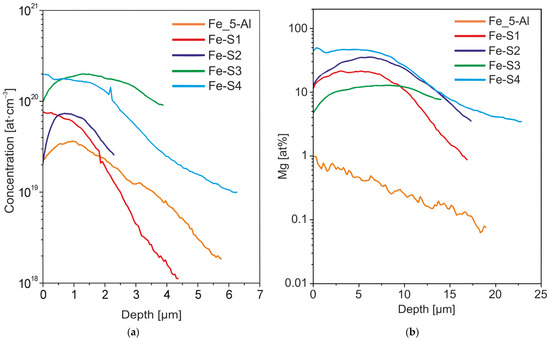 As can be seen (Figure 4a), the highest nitrogen concentrations are achieved in the aluminum (Al) substrate. The presence of magnesium in all durals, contrary to its beneficial effect on the kinetics of aluminum nitride formation, AlN, in glow nitriding processes [9] described in the literature, limits the concentration and range of nitrogen diffusion in the substrate compared to aluminum. Only for the G-AlMg7 alloy with highest magnesium content (Fe-S4 variant), the diffusion range seems to be comparable to aluminum, but the nitrogen concentration reaches levels that are an order of magnitude lower. In turn, research on the influence of the substrate condition on the nitriding efficiency conducted on the AlCu2Mg2NiSi (S2) alloy, the results of which are shown in Figure 4b, shows that the preliminary precipitation hardening heat treatment of the substrate has a significant impact on the diffusion of nitrogen in the aluminum substrate. Analysis of the distribution of other elements present in the aluminum substrate of nitrided aluminum alloys allows for the detection of increased oxygen concentration (Figure 5a).
