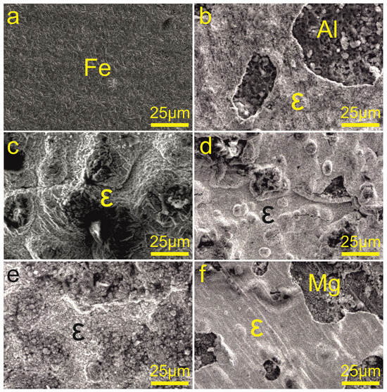 Surface morphology (SEM) of aluminum substrates covered with an iron coating (a) in the initial as-deposited state and (b–f) after gas nitriding in the hybrid method on (b) technical aluminum EN AW-1050A (A1); (c) AlCu4Mg1 alloy (S1); (d) AlCu2Mg2NiSi alloy (S2); (e) AlZn6Mg2Cu2 alloy (S3)y; (f) G-AlMg7 alloy (S4).
