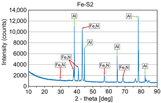 In the second stage of the hybrid processing, the substrates with metal coatings were gas nitrided at a temperature of 530 °C for 10 h. This temperature was selected as the maximum acceptable, taking into account the relatively low melting point of the AlCu4Mg1 alloy (S1) [9]. Nitriding was carried out in an atmosphere of 5N ammonia, which ensures that gas contamination with trace of oxygen is at the level of a maximum of 2 ppm. The processes were carried out in a device equipped with a quartz retort, a gas supply installation, and equipment with an appropriately high tightness class. The aim of these precautions was to limit as much as possible the contamination of the nitriding atmosphere with oxygen and, as a result, to limit the risk of oxygen access to the aluminum substrate and thus to avoid its re-oxidation. It should be noted that in the case of the nitriding of substrates covered with a nitride-forming metal coating, including iron, the process transforms the coating into a nitride layer through which the nitrogen actually migrates to the proper aluminum substrate. To eliminate the risk of spalling of the coatings from the substrate during sample heating and cooling, the rate of these operations was controlled by extending their time to 1 h for heating and 5 h for cooling.