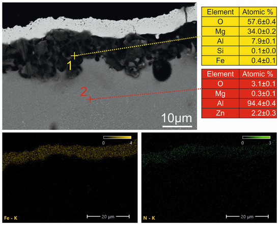 Chemical composition and element distribution in the dark zone in the aluminum substrate adjacent to the outer iron nitride layer for gas-nitrided (530 °C/10 h) AlZn6Mg2Cu2 alloy previously covered with an iron coating (EDS point and surface X-ray microanalysis).