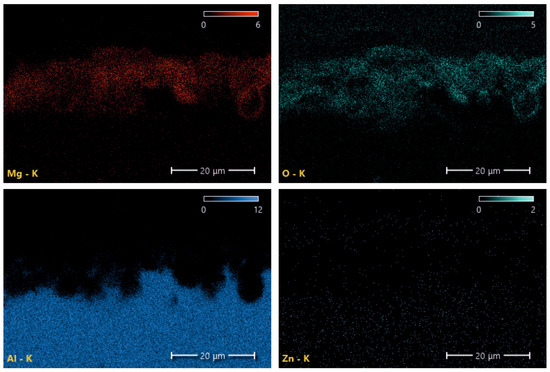 In the zone of the substrate adjacent to the outer layer of the iron nitride, next to aluminum, a much higher concentration of magnesium than the nominal content in the alloy is also observed, and its level clearly correlates with the magnesium content in the aluminum alloy. The segregation of magnesium in the near-surface zone of aluminum substrates is most likely the result of selective back diffusion of magnesium from the core to the surface, where it reacts with oxygen which may be supplied in trace amounts in the nitriding atmosphere. According to the mechanism described by Kimura et al. [45], magnesium will also reduce aluminum oxide Al2O which may locally occur as persisting residues of the passive layer fragments. As a result of the back diffusion of magnesium and its oxidation reaction, magnesium oxide, MgO, is formed, the presence of which in the near-surface zone of aluminum substrates may be the reason for the reduced kinetics of the magnesium diffusion observed in alloyed substrates containing magnesium (Figure 4). The magnesium content in the alloy most likely increases the share of oxide in the near-surface zone, intensifying the influence of magnesium on the kinetics of nitrogen diffusion in the substrate, which is reflected in the behavior of the G-AlMg7 alloy (Figure 4a). It should also be noted that the reduction of Al2O3 oxide with magnesium leads to the formation of pure aluminum “in statu nascendi”, which undoubtedly favors the reaction with atomic nitrogen diffusing to the substrate and the creation of the AlN nitride effect [45]. However, it cannot be ruled out that nitrogen in the diffusion zone combines not only with aluminum but also locally with magnesium, forming magnesium nitride, Mg3N2 [47]. The recent advanced transmission electron microscopy investigations provide the evidence of the Mg3N2-type magnesium nitride formation in the layers produced in plasma nitrided aluminum–silicon alloy substrate [48].