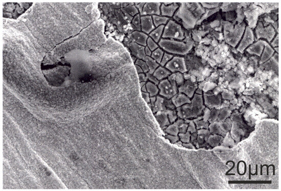View (SEM) of the substrate in the area where the outer layer of iron nitride produced in hybrid process on the G-AlMg7 alloy has been exfoliated.