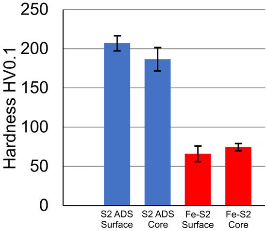 Hardness HV0.1 of the surface and core of the AlCu2Mg2NiSi alloy covered with an iron coating for as-delivered (ADS) and gas-nitrided (530 °C/10 h) variants.