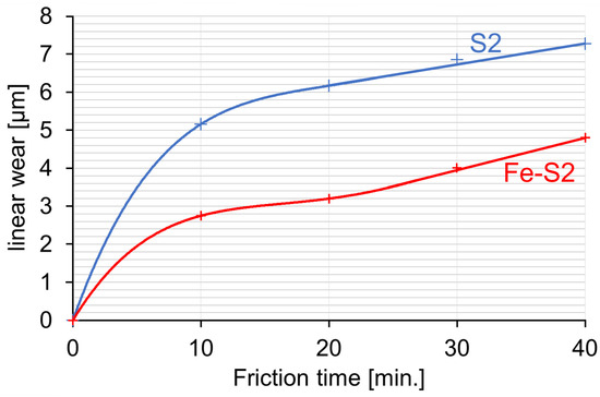 AlCu2Mg2NiS alloy linear wear in the roll-on-disc test under 10 N load alloy in as-delivered state ADS (S2) and after hybrid treatment (Fe-S2).