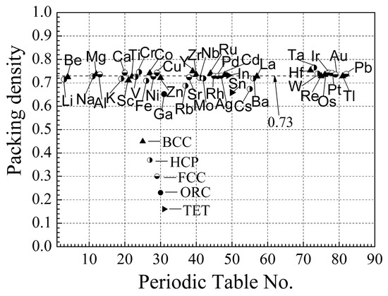 Packing density of various elemental metal distribution on the periodic table. Here, lattices: BCC—body-centered cubic; HCP—hexagonal close-packed; FCC—face-centered cubic; ORC—orthorhombic; TET—tetragonal. The dashed line (0.73) corresponds to the ideal close-packed lattice.