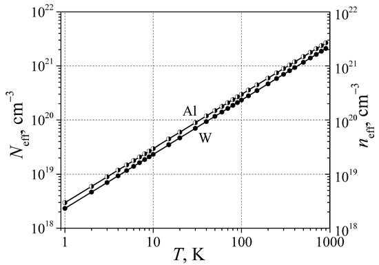 In [13,14], it was shown that lattice atom vibrations produce not only the effective density of free randomly moving electrons (here is the density of states at Fermi-level energy) but also the same density of electronic defects (not completely screened ions) is produced . In Figure 2, the electronic defect dependence on temperature for aluminum and for the transition group metal tungsten are demonstrated. As can be seen, the effective density of the electronic defects even at a temperature of 1 K is higher than 1018 cm−3, and these electronic defects cannot in principle be decreased, as can be achieved with residual defects.