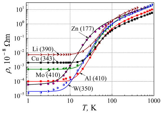 For further study of the resistivity dependence on temperature, we shall investigate the elemental metals from various sites of the periodic tables: the alkali group metal Li, the noble metal Cu, the second group IIB metal Zn, the third group IIIA metal Al, and the transition group metals Mo and W. The resistivity dependences on temperature for these metals are presented in Figure 3: dots are the experimental results, and the solid lines are calculated by Equation (13). As can be seen, the resistivity (T) of metals has three clearly expressed parts: (i) at low temperature, the so-named residual resistivity caused by impurity and structural imperfections of metal, (ii) the so-named phonon-assisted part with ρ ~ T5, which at higher temperatures crosses to (iii) the linear resistivity dependence on temperature.