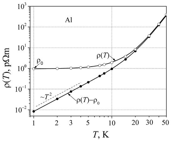 Aluminum is a simple polyvalent metal in which electron–electron scattering has been intensively investigated [41,42,43,44]. In [41], the electrical resistivity of aluminum at low temperatures is described by the term AT2. The surface scattering contribution for electrical resistivity of high-purity aluminum samples in the thickness range from 0.1 μm to 7 mm was investigated in [42]. It was shown that surface scattering of the conduction electrons affects the temperature dependence of the resistivity for samples less than 0.5 mm in thickness. The electrical resistivity term AT2 is attributed to electron–electron scattering, and it has been shown that coefficient A practically does not depend on the residual resistivity value [43]. The influence of the electron–phonon interaction on electron–electron scattering is described within the framework of the Landau Fermi liquid theory, and electron–electron scattering contribution to the low-temperature resistivity of aluminum can be enhanced by a factor of ~20 due to electron–phonon interaction [44].