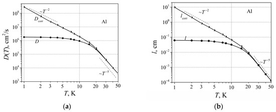 As can be seen, the resistivity () without residual resistivity has a well-expressed dependence on temperature term AT2, where the proportionality coefficient A ≈ 6.5 fΩm K−2. Now the resistivity of metals can be described as , where D is the diffusion coefficient of free RM charge carriers. The diffusion coefficient of free RM charge carrier dependence on temperature is shown in Figure 5a. As can be seen, the diffusion coefficient at very low temperatures changes as T−2 and then crosses to the proportionality T−5 when the temperature is over 20 K.