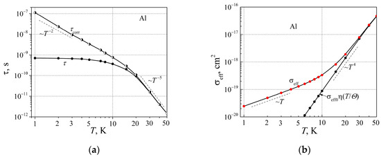 The relaxation time (a) and the effective scattering cross section (b) dependences on the temperature at low temperatures for aluminum (the is described by Equation (17), and by Equation (16)).