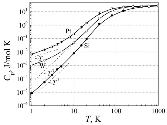 In Figure 7, the heat capacity dependence on temperature for conductors (Pt and W), and pure Si, which at low temperatures is an insulator, is presented. The heat capacity of the insulator is described by Debye’s model, for which the heat capacity at low temperatures increases as or the thermal energy (quantity of heat) increases as . In the case of metals, the heat capacity at low temperatures changes more slowly, approximately linearly, and thermal energy changes as T2. As can be seen, the metal of the one-mole mass at temperature 5 K has greater heat than the insulator. This difference is related to the free electron excitation and their random movement, and due to their scattering by electronic defects. In equilibrium, the thermal energies between free electrons and lattice atoms are changing by the interaction of free electrons with the electronic defects.