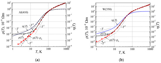 The similar results in Figure 8b to aluminum (Figure 8a) are the investigation results for tungsten. Though tungsten has double the valence electrons of aluminum, the DOS g(EF) of tungsten is about 1.3 times smaller than that of aluminum. The residual resistivity of a given sample of tungsten is about 10 times smaller than that of aluminum. The difference between resistance and ( at low temperatures for aluminum begins at T < 20 K, while for tungsten it is at T < 8 K and the coefficient A ≈ 8 fΩm/K2. The phonon mediation factor η(T) dependences on temperature are almost the same for both metals.