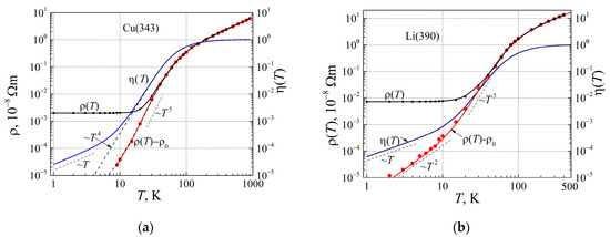In Figure 10, the resistivity and corrected phonon mediation factor dependences on temperature for copper and lithium are presented. Considering that the presented sample of the copper resistivity data has sufficiently high residual resistivity, it was not possible to observe the T2 dependence on temperature (Figure 10a). As seen in this figure, the resistivity ( changes at low temperatures approximate to T4, and similar behavior has been observed for other noble metals [37,40]. On the other hand, the linear part of the corrected phonon mediation factor begins only below 4 K, and from this, it follows that the resistivity law AT2 can be obtained at resistivity values smaller than 10 fΩm. This perhaps explains why the resistivity law AT2 for noble metals is difficult to obtain. In Figure 10b, the resistivity and corrected phonon mediation factor dependences for lithium are presented. As can be seen, the linear part of the corrected phonon mediation factor begins below 7 K, the square resistivity dependence on temperature is observed at a temperature below 7 K, and the proportionality coefficient A is approximately equal to 20 fΩm/K2.