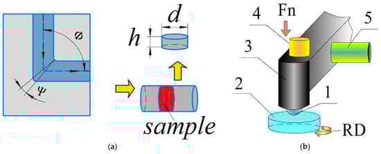 ECAP die geometry and sample preparation scheme (a); sliding test scheme with AE and VA sensors (b). 1—counterpart (ball), 2—AA7075 disk, 3—AE sensor, 4 and 5—vibration sensors.