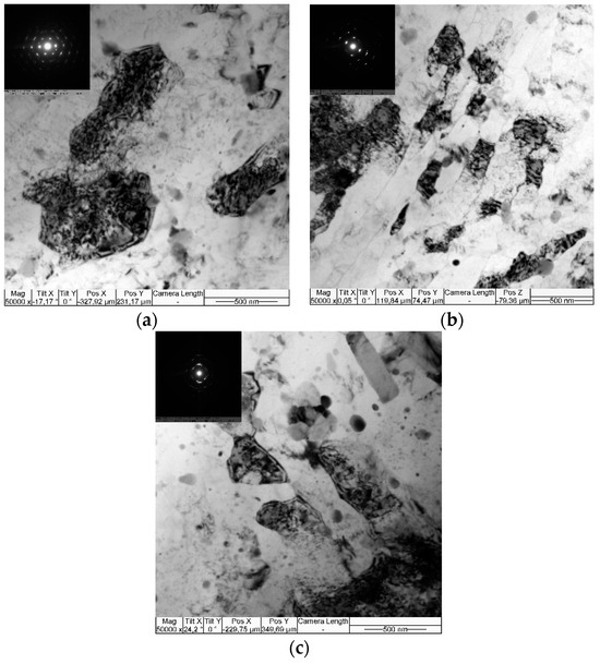 The ECAP die is an efficient tool for grain–subgrain structure refinement by severe plastic deformation (SPD) so that ~700 nm size grains were obtained after one-pass ECAP (Figure 2a with inset). These grains contain dislocations and therefore give the SAED reflections with noticeable azimuthal misorientations. The two-pass ECAP formed banded grain structures with high-angle boundaries separating these grains from each other (Figure 2b). These banded grains with an aspect ratio of 0.2:1 μm demonstrated their SAED reflections with a higher degree of azimuthal misorientation (Figure 2b, inset). Fine, 250–300 nm, size grains were formed after the four-pass ECAP with SAED reflections characterized by wider azimuthal misorientation (Figure 2c), which, in addition to dislocation density, might be a result of further grain refinement, i.e., 50 nm dynamically recrystallized grains that were surrounded by intermetallic precipitates.