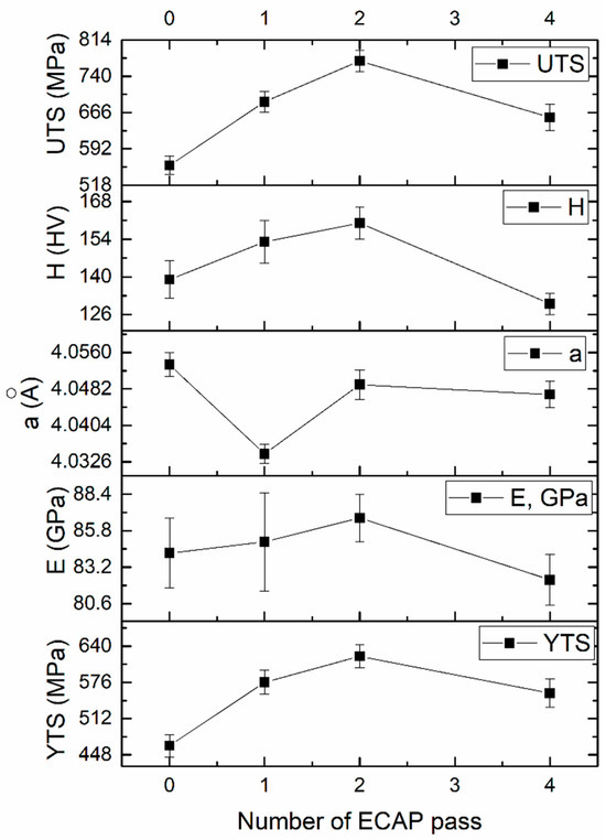The mechanical characteristics of the materials are determined by hardening mechanisms that might contribute to the mechanical strength and plasticity levels of AA7075 samples: (1) grain refinement according to the Hall–Petch law, (2) dispersion hardening by coherent intermetallic precipitates, and (3) solid-solution hardening. The precipitates capable of providing the effect of dispersion hardening of AA7075 include coherent η’ (MgZn2) particles, which usually grow from Guinier–Preston (GP) zones nucleated in the supersaturated solid solution during aging. Therefore, the above-discussed in terms of lattice parameter change situations with precipitation and dissolution of precipitates may be related to evolution of mechanical characteristics depending on the ECAP pass number.