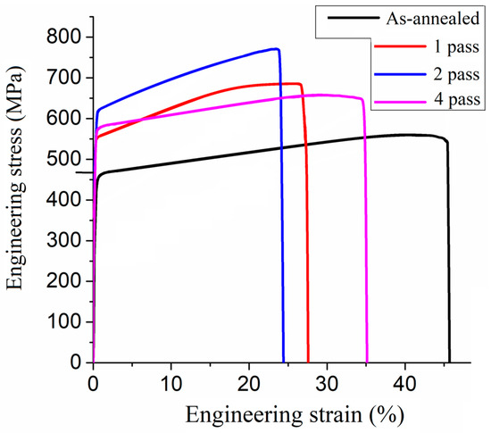 Higher values of both YTS and UTS have been obtained after one-pass ECAP as compared to that of the as-annealed sample (Figure 4 and Figure 5). The same behavior was observed for the elasticity modulus obtained from the nanoindentation according to the Oliver–Pharr method. The level of nanohardness, however, increased to 153 HV (Figure 4). This sample also possessed a plasticity lower than that of the as-annealed sample (Figure 5). The improvements in both tensile UTS and YTS after one-pass ECAP may be related to grain refinement and solid-solution hardening, which is determined by dissolution of alloying elements in α-Al, which is observed by the lattice constant decrease from 4.0534 Ǻ to 4.0343 Ǻ (Figure 4).