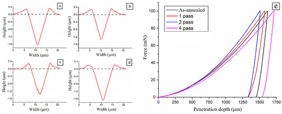 Nanoindentation profiles from as-annealed (a) and 1-pass (b), 2-pass (c) and 4-pass (d) ECAPed AA7075 samples. Nanoindentation curves (e).