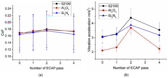 The effect of ECAP pass number and counterbody material on coefficient of friction (a) and vibration acceleration (b).