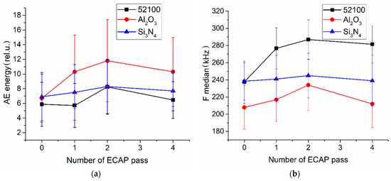 The increase in median frequency was related to domination of brittle fractures and, vice versa, median frequency reduced in viscous fractures [48]. As soon as the mechanical characteristics of the samples are determined by their microstructures resulting from the ECAP, their deformation and fractures in the sliding test may be monitored by means of AE signals.
