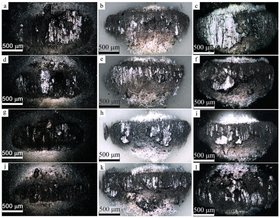 Optical micrographs of the worn surfaces on the 52100 steel (a,d,g,j), Al2O3 (b,e,h,k) and Si3N4 (c,f,i,l) balls covered with metal transferred from the samples. As-annealed (a–c), 1-pass (d–f), 2-pass (g–i), 4-pass (j–l) AA7075.