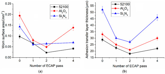 Effect of ECAP pass number and counterbody material on worn surface area (a) and adhesion transfer layer thickness (b).