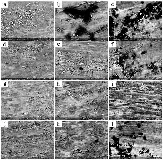 SEM BSE images of the wear track surfaces on AA7075 samples obtained in sliding with 52100 steel (a,d,g,j), Al2O3 (b,e,h,k) and Si3N4 (c,f,i,l) balls. As-annealed (a–c), 1-pass (d–f), 2-pass (g–i), 4-pass (j–l) AA7075.