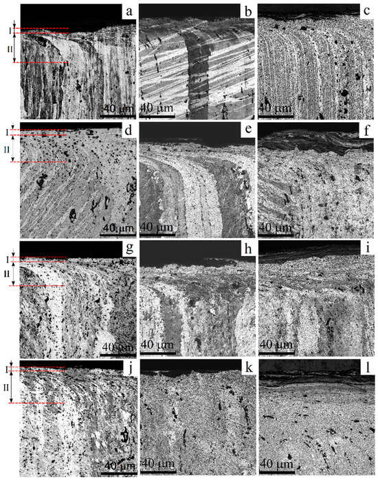 Subsurface regions of the samples have been examined using metallographic polished views prepared by sectioning the samples in the vertical plane parallel to the sliding direction and perpendicular to the top surface (Figure 14). These metallographic views distinguished at least two subsurface deformed layers such as (I) the severely deformed one below the worn surface and (II) the underlying layer, with the strain gradually reducing to zero in the base undeformed AA7075 metal. It may be noted that the total strain penetration depth, as well as layer I and II thicknesses, depended on AA7075’s structural state and the type of the counterpart material. The layer thicknesses are most greatly changed when using ceramic balls.