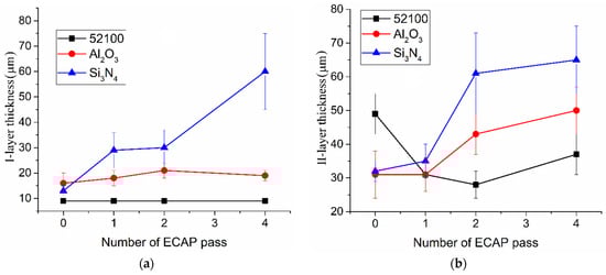 The layer II thickness is reduced when using the steel ball (Figure 15b) on the ECAPed samples, but this situation is changed when using the ceramic balls instead. ECAPed samples demonstrate increased thicknesses of the deformed layers compared to that of the as-annealed one. The reason behind such a finding may be the generation of the adhesion transfer layer under conditions of enhanced stick-slip vibration.