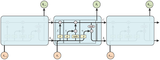 where , , and denote the forget gate, the input gate, and the output gate, respectively; denotes the unit state of the network; and denote the hidden state at moment and , respectively; and are the weight and bias matrices, respectively; denotes the sigmoid activation function; and tanh is a hyperbolic tangent activation function.