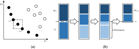 - Calculation of crowding distance: The crowding distance is used to measure the diversity of populations. The schematic diagram of crowding distance is shown in Figure 4a. The x-axis of the graph represents the objective function, and the y-axis represents the crowding distance. A point on the graph represents each candidate solution. The candidate solution that is closer to the left side of the graph indicates better performance on the objective function. The candidate solution that is closer to the top of the graph indicates a sparser distribution within the entire solution set, with a higher crowding distance and greater diversity. The density between candidate solutions can be measured by the distance on the x-axis. Solutions that are closer together in terms of the x-axis distance suggest that they have similar performance on the objective function. The crowding distance of the individual in the population is calculated aswhere denotes the crowding distance of individual , and denotes the -th objective function of individual . The crowding distance between the first and last individuals is expressed as . After performing fast non-dominated sorting and calculating the crowding distance, each individual in the population obtains two attributes: non-domination rank and crowding distance . With these two attributes, the dominant relationship between any two individuals in the population can be determined.
